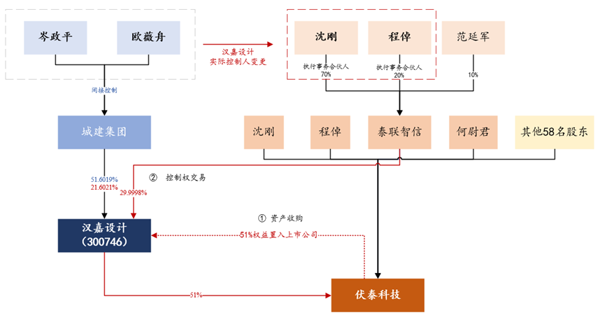 2.同日,汉嘉设计控股股东浙江城建集团股份有限公司(以下简称“城建集团”)与泰联智信签署了《关于汉嘉设计集团股份有限公司股份转让协议》,泰联智信以协议转让方式受让城建集团持有的公司67,721,000股股份,转让股份合计占汉嘉设计总股本的29.9998%(以下简称“本次控制权收购”)。本次控制权收购以本次资产收购完成作为先决条件。本次控制权收购事项实施完成后,汉嘉设计控股股东将由城建集团变更为泰联智信,汉嘉设计实际控制人将由岑政平、欧薇舟夫妇变更为沈刚、程倬。