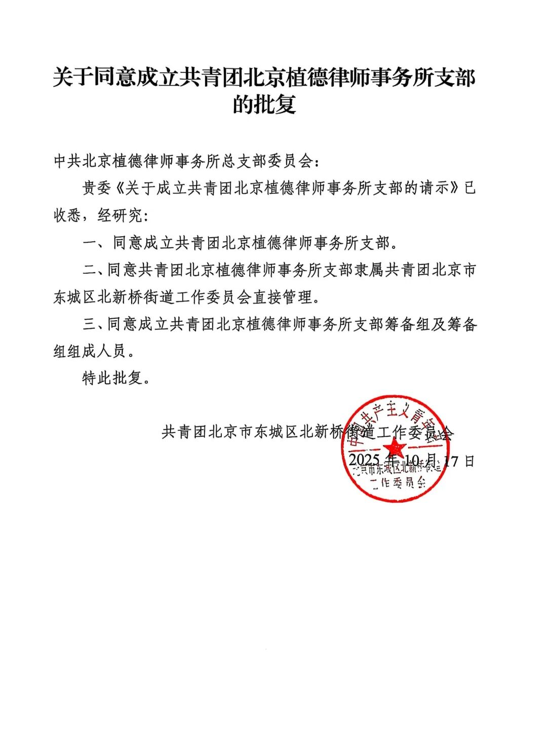 为积极响应并深入贯彻总书记关于青年工作的重要论述,强化青年律师队伍的思想建设和组织建设,经中共北京植德律师事务所总支部委员会同意,2025年10月17日,共青团北京市东城区北新桥街道工作委员会正式批准共青团北京植德律师事务所支部委员会(以下简称“团支部”)成立。