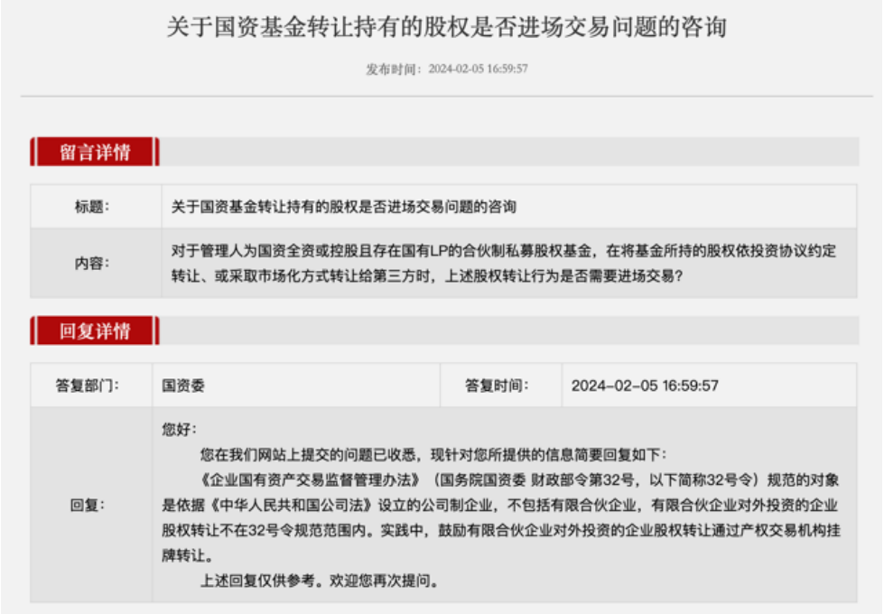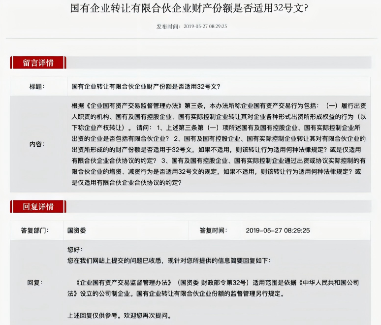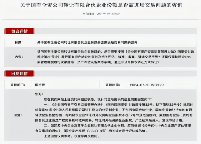 国有出资的有限合伙企业不视为国有股东,但针对国有出资部分的合伙份额转让是否需要按照《企业国有资产交易监督管理办法》的规定履行相应的程序?国务院国资委网站通过问答回复的方式进行了明确,具体见下述官网截图: