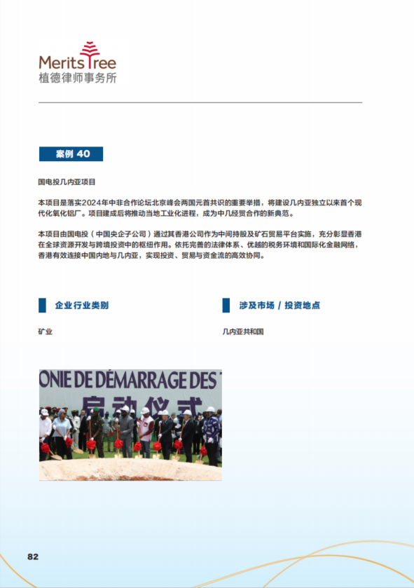 作为与该平台配套发布的专业资料,《香港专业服务助力中国内地企业出海成功案例实录》(后称“案例实录”)首次发布,收录超过50个具有代表性的成功案例。植德律师事务所凭借专业扎实的出海业务服务能力,有两个申报项目脱颖而出,被成功收录于案例实录中,分别是(1)合伙人蔡庆虹律师领导的西芒杜矿山与基础设施一体化项目及(2)合伙人高洋律师与蔡庆虹律师共同领导的国电投几内亚项目。相关案例获收录于案例实录中,此次收录彰显了植德在助力内地企业应对国际化挑战中的专业价值。