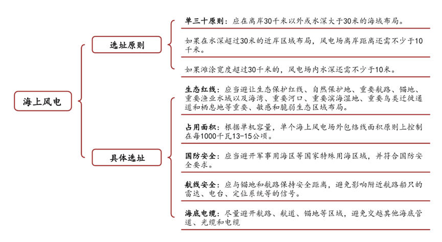 多位于近海水域,水深约10米以上。十四五期间重点布局于山东半岛、长三角、闽南、粤东、北部湾五大海上风电基地集群。 |