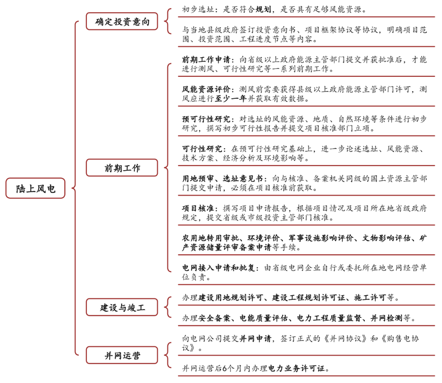 风力发电项目的开发过程主要包括四大环节:选址、前期工作与核准、建设、并网。陆上风电项目开发过程的主要行政审批内容包括: