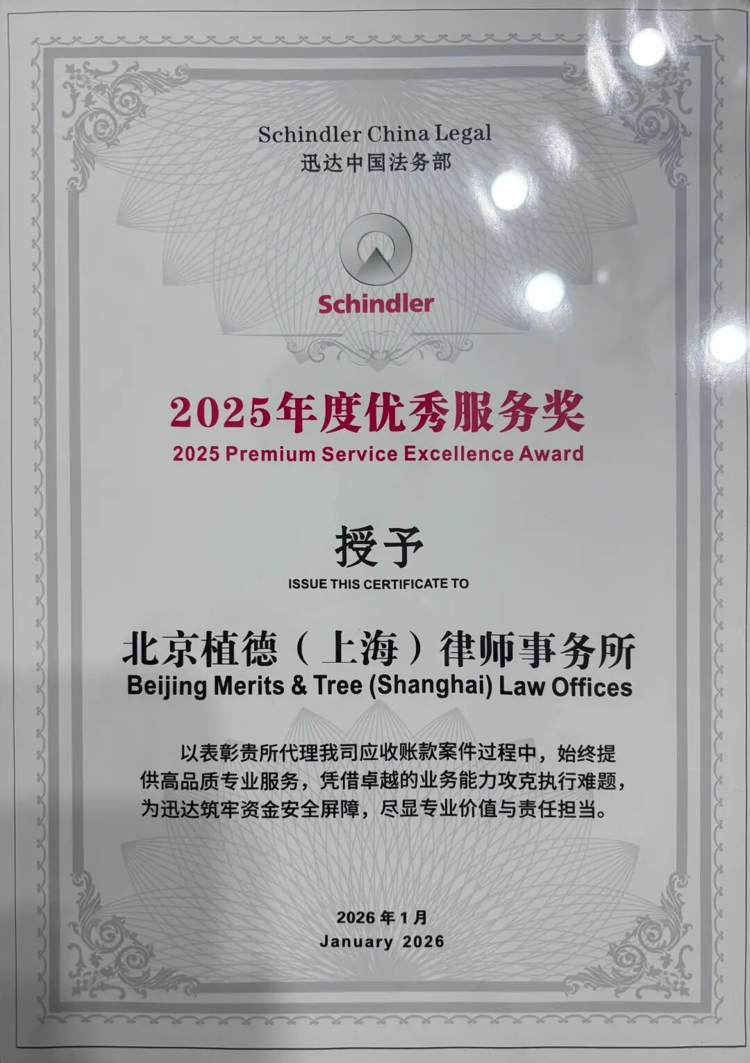 近日,凭借在诉讼案件处理中的卓越表现,植德律师事务所荣获客户迅达颁发的“2025年度优秀服务奖”。该奖项充分肯定了植德在跨区域协同办案、诉讼策略执行及回款管理等方面的突出成果。