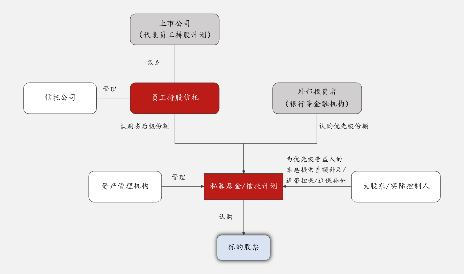 第一,信托作为结构化融资工具为员工持股计划进行结构化配资,具体结构如下: