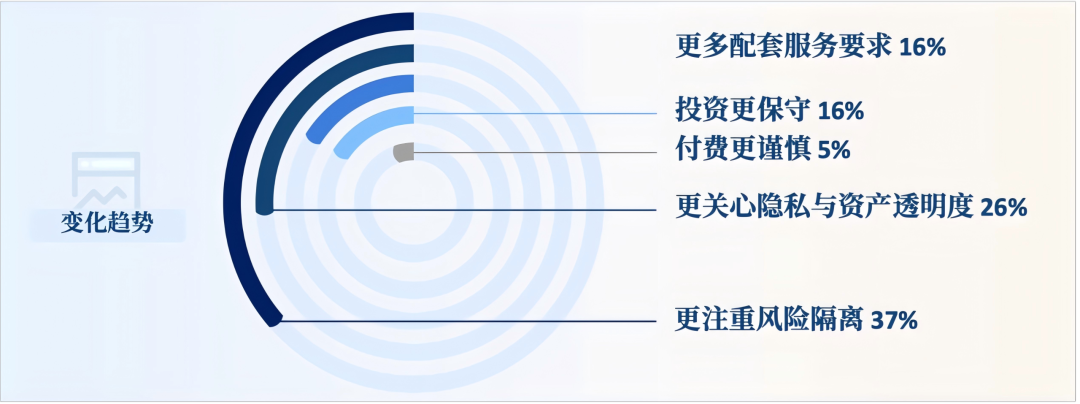结合调研结果与宏观形势,我们倾向于认为:一方面,地缘政治冲突频发、全球经济复苏乏力,同时叠加国内经济面临周期性调整的背景,使高净值客户对资产安全性和长期稳定性的关注显著上升;另一方面,CRS信息交换持续深化、跨境税收征管趋严,境内低利率环境下传统理财收益空间压缩,安全的结构性资产短缺、金融及特定行业领域信用风险事件频发,使客户逐步从“收益优先”转向“风险优先”。在此背景下,高净值客户的整体投资态度趋于保守,付费决策更为审慎,但对风险隔离、资产透明度、合规确定性的需求却明显增强。