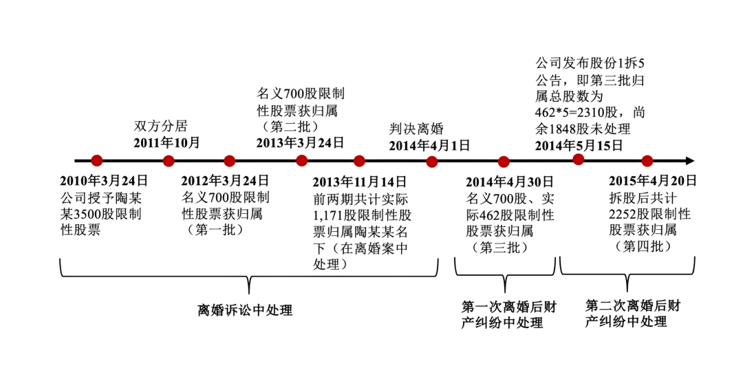 2014年5月15日,陶某某就职公司发布股份1拆5的拆股公告;2015年4月20日,陶某某获得第四批非限制性股票共计2252股,后佘某某第二次提起离婚后财产纠纷,要求分割:第一,第三批股票经拆股后、扣除第一次诉讼已处理部分的剩余权益;第二,第四批归属的限制性股票(共计2252股)。