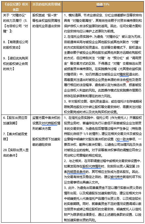 由于《会议纪要》涉及内容较多,而信托实务又具有细节庞杂的特征,植德在此特以“一表通”的形式就信托实务中涉及与《会议纪要》相关的内容进行梳理,简要提示交易中可能遇到的关注点(TIPs),以期为读者呈现不止于《会议纪要》第七部分而需要在信托业务实践中重点关注的相关问题提供索引,就其中部分相关内容的详细分析敬请关注本文后续的中篇和下篇。