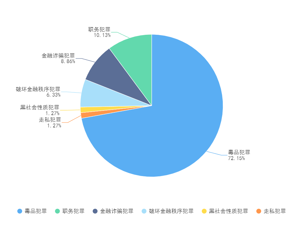 在2021-2023年的自洗钱案件中,上游犯罪以毒品犯罪为主,达72.15%,具体包括贩卖毒品罪和制造毒品罪;其次是职务犯罪,占10.13%,包括贪污罪和受贿罪;其后是金融诈骗犯罪,占8.86%,包括集资诈骗罪,贷款诈骗罪,信用卡诈骗罪;然后是破坏金融管理秩序犯罪,占6.33%,包括非法吸收公众存款罪,妨害信用卡管理罪,违法发放贷款罪;黑社会性质犯罪和走私犯罪各1件,分别占1.27%。
