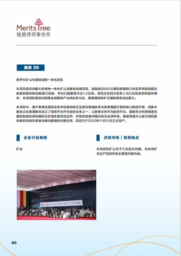 作为与该平台配套发布的专业资料,《香港专业服务助力中国内地企业出海成功案例实录》(后称“案例实录”)首次发布,收录超过50个具有代表性的成功案例。植德律师事务所凭借专业扎实的出海业务服务能力,有两个申报项目脱颖而出,被成功收录于案例实录中,分别是(1)合伙人蔡庆虹律师领导的西芒杜矿山与基础设施一体化项目及(2)合伙人高洋律师与蔡庆虹律师共同领导的国电投几内亚项目。相关案例获收录于案例实录中,此次收录彰显了植德在助力内地企业应对国际化挑战中的专业价值。