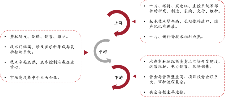 我国的风电产业已形成从上游零部件制造到下游电站运营的完整产业链;上游主要包括核心零部件制造,如叶片、塔筒、发电机、主控系统等;中游为整机制造与集成;下游则为风电场的投资、建设与运维。