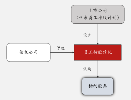 (2)非杠杆型员工持股计划系员工持股计划的资金均来源于员工合法薪酬、自筹资金以及法律法规允许的其他方式取得的资金,部分案例资金来源于公司奖励基金,信托工具参与非杠杆型员工持股计划时,往往回归信托本源,受人之托,忠人之事,根据委托人指令为员工持股计划提供中立托管和运营支持,具体结构如下: