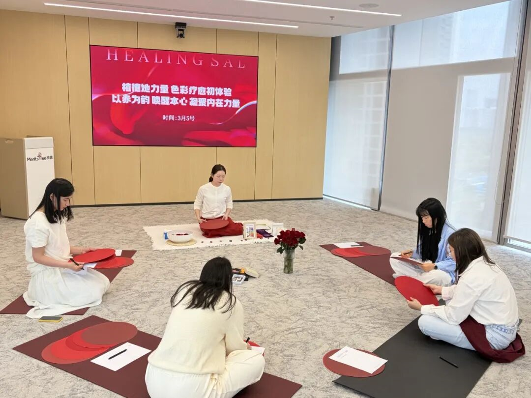 红色,是生命的热烈,也是内心的安全感。深圳办公室以一场红色主题疗愈活动,唤醒女性内在力量。老师手中徐徐展开红色系色卡,大家敞开心扉,诉说职场困惑与情绪诉求;老师一一记录,细致解读红色给予人能量与安全感的底层逻辑。随后的 “力量之地” 冥想环节,众人静坐于红色地垫上,跟随指引调整呼吸,在红色的温暖包裹中沉入内心。冥想结束,老师为每位同事一对一解惑 —— 有人豁然开朗,有人热泪盈眶。那一刻,红色不再是简单的色彩,而是被唤醒的力量,是植德女性从内而外散发的赤韵光芒。