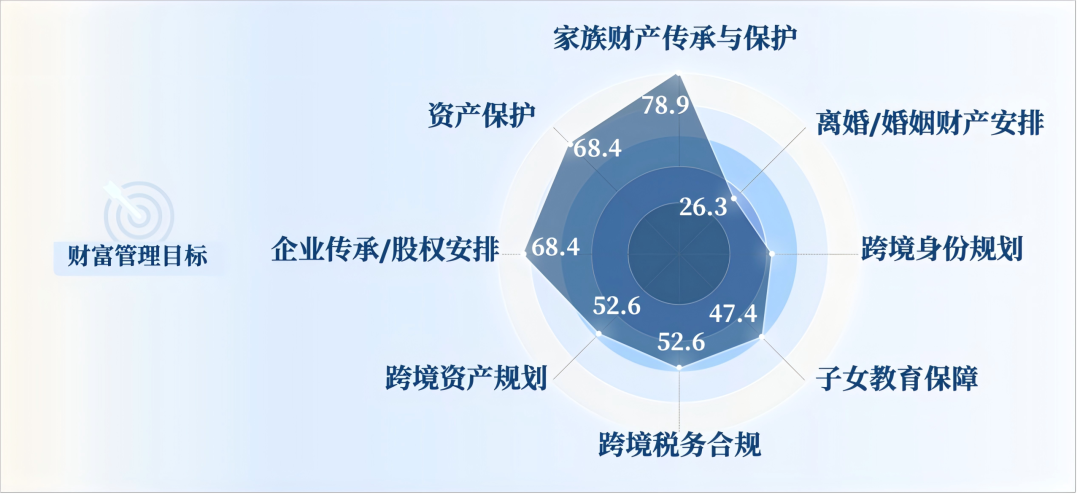这一宏观变化,在财富管理服务信托领域集中体现为客户需求结构的显著升级与分化。结合调研数据,2025年客户关注的核心目标已不再局限于单一财富增值,而是呈现出多维度并行的特征:资产保护与风险隔离仍是基础性诉求,家族传承与企业股权安排成为高频场景,跨境资产与身份规划、税务合规需求明显上升,婚姻财产安排、子女教育与养老保障等家庭治理型目标亦同步凸显。在上述多重目标交织并行的背景下,财富管理服务信托因其在财产独立性、制度稳定性与结构可塑性方面的优势,随着客户通过专业机构、同业案例及多渠道信息对信托制度认知的不断加深,正逐渐被纳入高净值家庭进行整体财富规划时的可选优质方案。